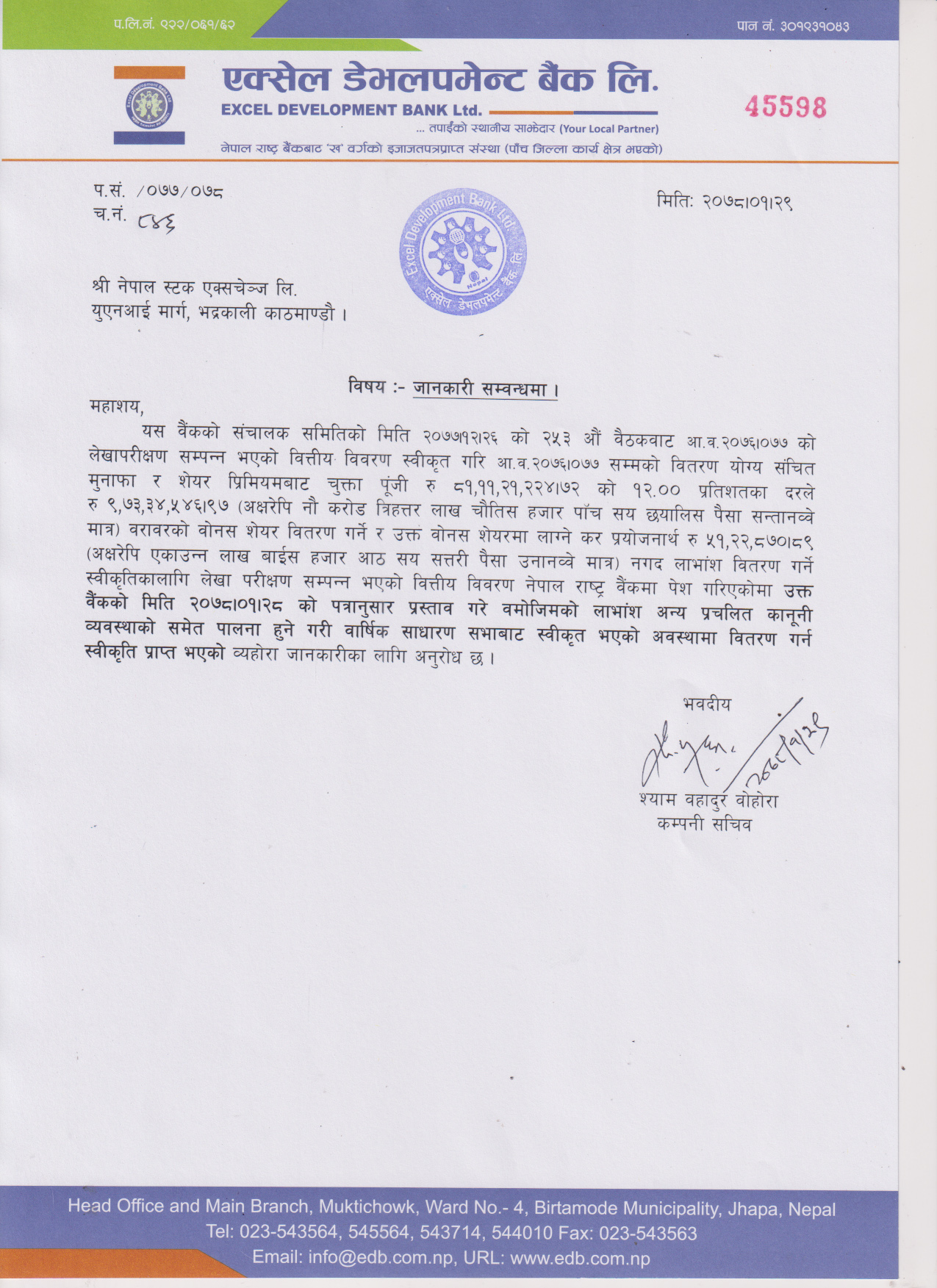 सोही लाभांश राष्ट्र बैंकले स्वीकृत गरेको हो । अब उक्त प्रस्तावित लाभांश संस्थाको आगामी वार्षिक साधारण सभाले अनुमोदन गरेपछि वितरण हुनेछ ।