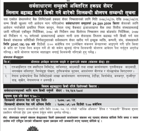 शेयर बिक्रि प्रबन्धकमा एनआईबिएल एस क्यापिटल रहेको छ । लिलामीको शेयरको लागि एनआईबिएल एस क्यापिटल लिमिटेड, लाजिम्पाट, काठमाडौं तथा शाखा कार्यालयहरुः पुतलीसडक काठमाडौं, लगनखेल ललितपुर, चिप्लेढुङ्गा पोखरा, ट्राफिकचोक बुटवल, आदर्शनगर वीरगंज र गोल्छाचोक विराटनगरमा आवेदन दिन सकिने छ। त्यस्तै नेपाल इन्भेष्टमेन्ट बैंक लिमिटेडको शाखा कार्यालयहरु नारायणगढ, हेटौंडा, बिर्तामोड, जनकपुर, तुल्सीपुर दाङ, सुर्खेत, नेपालगन्ज र धनगढीमा आवेदन दिन सकिने छ ।