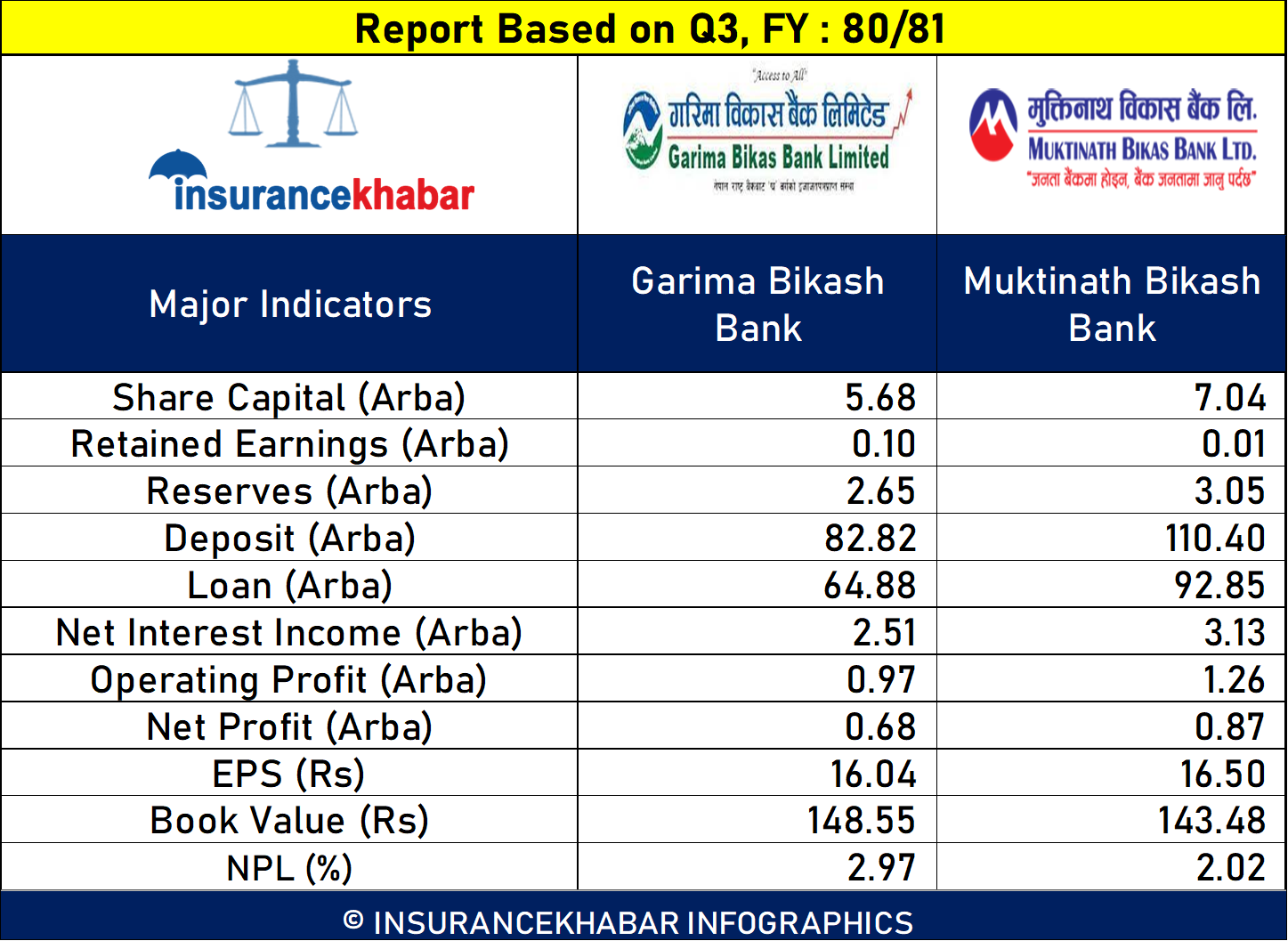 खुद मुनाफा : आर्थिक वर्ष ८०/८१को तेश्रो त्रैमासको वित्तीय विवरणको आधारमा गरिमा विकास बैंक लिमिटेडले ६८ करोड खुद नाफा गरेकोमा मुक्तिनाथ विकास बैंक लिमिटेडले ८७ करोड खुद नाफा गरेको छ ।