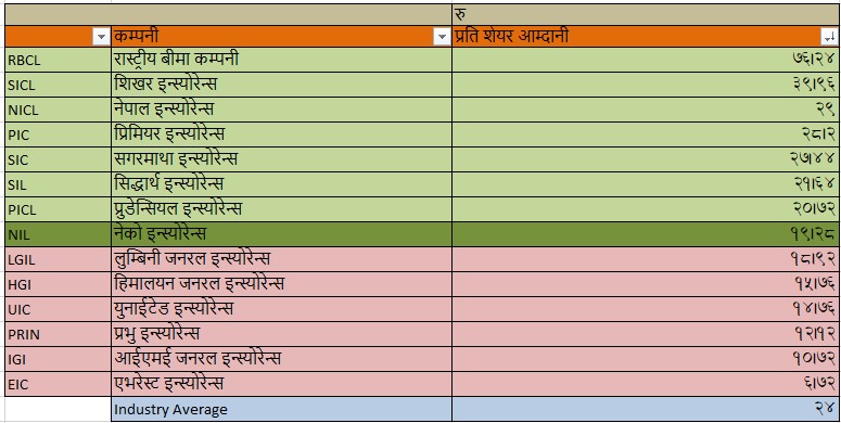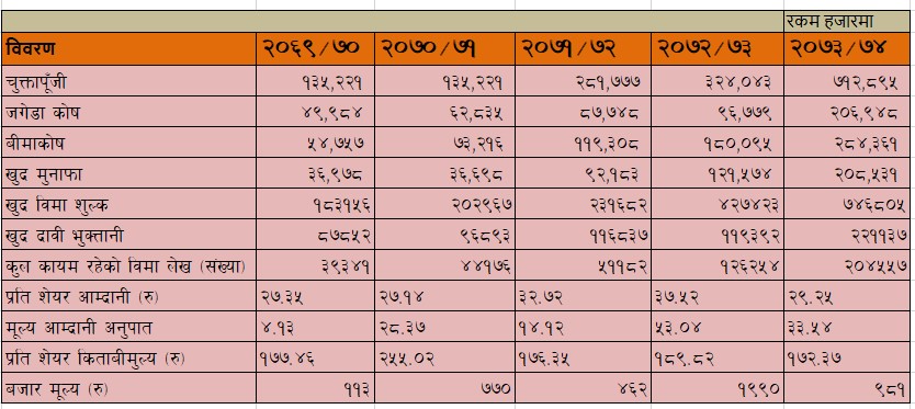 कम्पनीले बीमा समितिले तोकेको १ अर्ब पुँजीको लक्ष्य हासिल गरिसकेको अवस्था छ । कम्पनीले आफ्नो पुँजी ६५ प्रतिशतले वृद्धि गर्दा कम्पनीको खुद नाफा ५७ प्रतिशतले वृद्धि भयो। कम्पनीको प्रति शेयर आम्दानी सामान्य कम भए पनि पुँजी वृद्धि अनुरुप नाफा वृद्धि गरेको प्रस्ट देखिन्छ ।