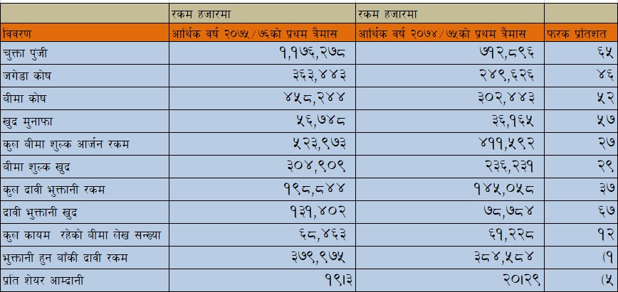 नेको इन्स्योरेन्सले सार्वजनिक गरेको चालु आर्थिक वर्षको प्रथम त्रैमासिक वित्तीय विवरण अनुसार आर्थिक वर्ष २०७५/७६ र २०७४/७५ बीच तुलना गर्दा :