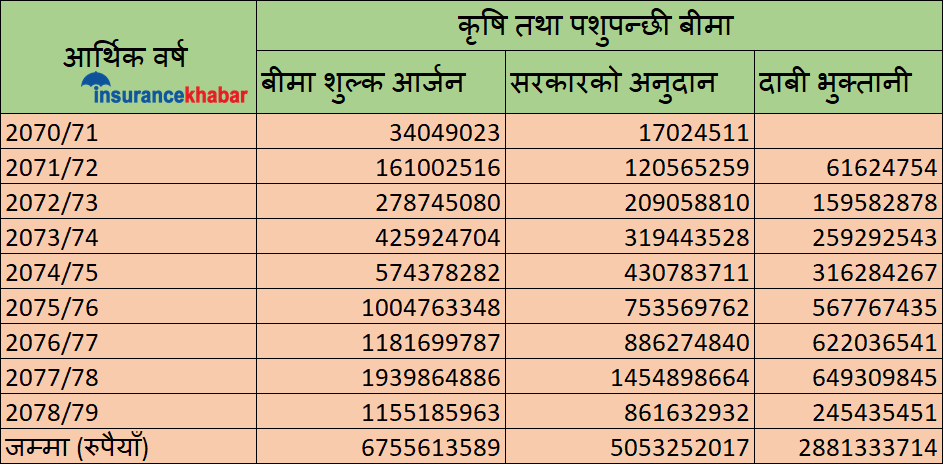 बीमा समितिले दिएको तथ्याङ्क अनुसार ९ वर्षको अवधिमा बीमा कम्पनीहरुले कृषि तथा पशुपन्छी बीमा बापत ६ अर्ब ७५ करोड ५६ लाख रुपैयाँ बीमा शुल्क आर्जन गरिसकेका छन् । तर कम्पनीहरुले भने कृषि तथा पशुपन्छी बीमा घाटाको व्यवसाय भएको भन्दै पन्छिने गरेका छन् ।
