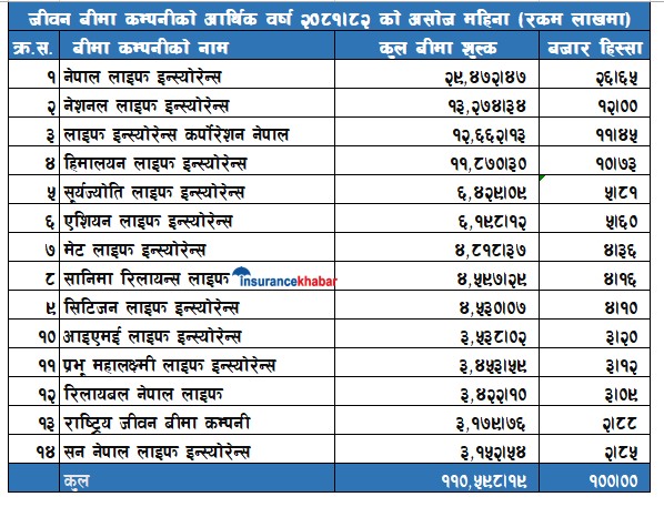 एक महिनामा सबैभन्दा धेरै नेपाल लाइफले कुल बीमाशुल्क संकलन गरेको छ । कम्पनीले २ अर्ब ९४ करोड रुपैयाँ कुल बीमाशुल्क संकलन गरेको हो । यस कम्पनीले कुल जीवन बीमा क्षेत्रको २६ दशलमव ६५ प्रतिशत हिस्सा ओगटेको छ । दोस्रोमा नेशनल लाइफ रहेको छ । कम्पनीले १ अर्ब ३२ करोड रुपैयाँ कुल बीमाशुल्क संकलन गरेको हो । यस कम्पनीले कुल जीवन बीमा क्षेत्रको १२ प्रतिशत हिस्सा ओगटेको छ । तेस्रोमा एलआइसी नेपाल रहेको छ । कम्पनीले यस अवधिमा १ अर्ब २६ करोड रुपैयाँ कुल बीमाशुल्क संकलन गरेको हो । यस कम्पनीले कुल जीवन बीमा क्षेत्रको ११ दशलमव ४५ प्रतिशत हिस्सा ओगटेको छ ।