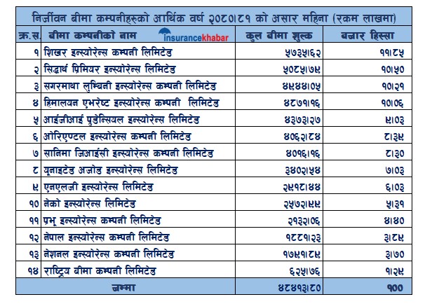 यता हिमालयन एभरेस्ट इन्स्योरेन्सले ४८ करोड ७१ लाख रुपैयाँ कुल बीमाशुल्क संकलन गरेको छ। जुन निर्जीवन बीमा कम्पनीहरुको कुल व्यापारमा यस कम्पनीको बजार हिस्सा १० प्रतिशत हो। आईजीआई प्रुडेन्सियल इन्स्योरेन्सले ४३ करोड ७३ लाख रुपैयाँ कुल बीमाशुल्क संकलन गरेको छ। जुन निर्जीवन बीमा कम्पनीहरुको कुल व्यापारमा यस कम्पनीको बजार हिस्सा ९ प्रतिशत रहेको छ। ओरिएन्टल इन्स्योरेन्सले ४० करोड ६२ लाख रुपैयाँ कुल बीमाशुल्क संकलन गरेको छ। जुन निर्जीवन बीमा कम्पनीहरुको कुल व्यापारमा यस कम्पनीको बजार हिस्सा ८ प्रतिशत रहेको छ।