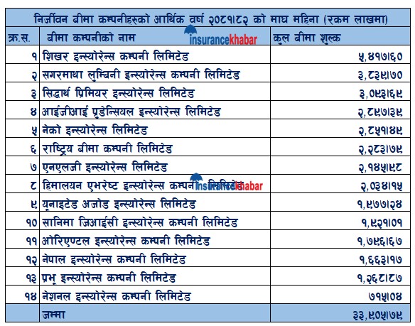 यस समीक्षा अवधिसम्ममा सबैभन्दा धेरै शिखर इन्स्योरेन्सले कुल बीमाशुल्क संकलन गरेको छ । कम्पनीले यस अवधिमा ५४ करोड १७ लाख रुपैयाँ कुल बीमाशुल्क संकलन गरेको छ । सगरमाथा लुम्बिनी इन्स्योरेन्सले ३८ करोड ३९ लाख रुपैयाँ कुल बीमाशुल्क संकलन गरेको छ । तेस्रोमा सिद्धार्थ प्रिमियर इन्स्योरेन्स रहेको छ । कम्पनीले यस अवधिमा ३० करोड ९३ लाख रुपैयाँ कुल बीमाशुल्क संकलन गरेको छ ।