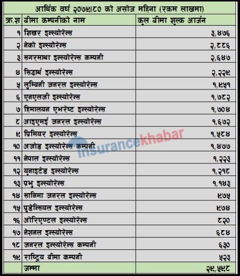 बीमा समितिको तथ्याङक अनुसार असोज महिनामा सबैभन्दा धेरै शिखर इन्स्योरेन्स कम्पनीले बीमा शुलक आर्जन गरेको छ । कम्पनीले यस अवधिमा ३४ करोड ७६ लाख रुपैयाँ बीमा शुलक आर्जन गरेको छ । दोस्रोमा नेको यन्स्योरेन्स कम्पनी रहेको छ । कम्पनीले यस अवधिमा २८ करोड ८६ लाख रुपैयाँ कुल बीमा शुल्क आर्जन गरेको छ ।