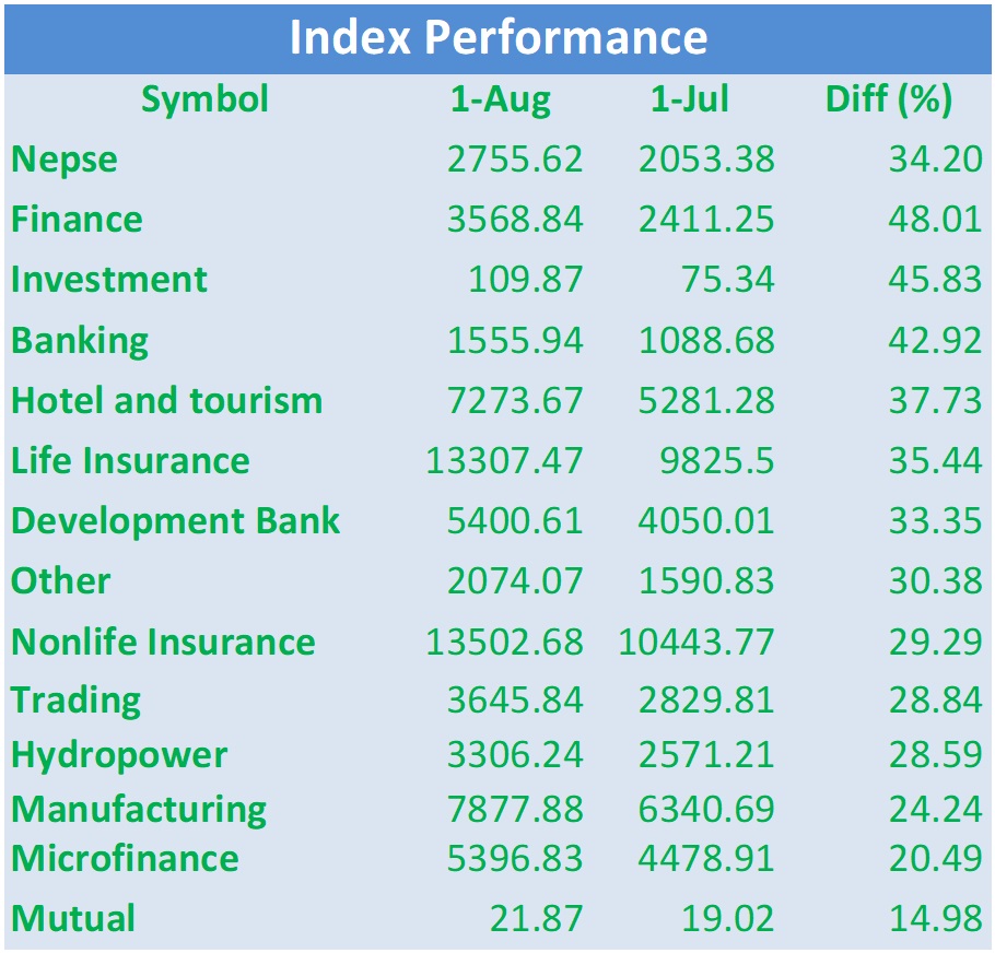 पछिल्लो १ महिनाको तथ्यांक हेर्ने हो भने शेयर बजार परिसूचक नेप्से इन्डेक्स ३४.२० प्रतिशतले बढेको छ। गत जुलाई १ मा २०५३.३८ को विन्दुमा रहेको नेप्से अगस्ट १ मा २७५५.६२ को विन्दुमा बन्द भएको छ। बजारमा आज सामान्य करेक्सन आएपछि यो १ महिनाको अवधिमा नेप्से ७०२.२४ अंकले बढेको छ।
