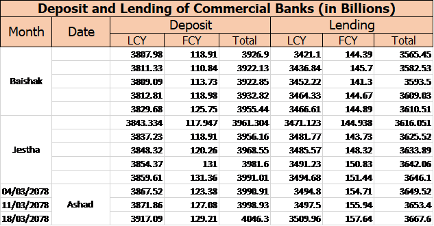 असार १८ गतेसम्ममा बाणिज्य बैंकहरुमा ४० खर्ब ४६ अर्ब रुपैयाँको निक्षेप जम्मा भएको छ । त्यस्तै कर्जा लगानी भने ३६ अर्ब ६८ अर्ब रुपैयाँको भएको छ । गएको फागुन चैत बैशाखमा बैंकहरुबाट अत्याधिक कर्जा लगानी भएको थियो । त्यस अवधिमा उद्योग व्यवसायीहरुले पुर्वाधारका लागि आवस्यक पर्ने सामाग्री आयातका लागि लिएका थिए । असारमा जति धेरै खर्च हुन्छ त्यहि अनुपातमा बैंकहरुमा निक्षेप पनि बढ्ने बैंकरहरु बताउछन् ।