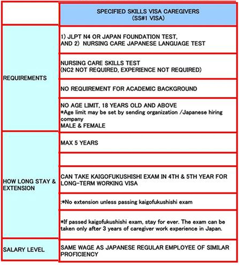 केयर गिभरमा जान एउटा तहको जापानिज भाषा र नर्सिङ तथा केयरिङ सम्बन्धी दुई वटा परिक्षा हुनेछ । जापानको स्वास्थ्य, श्रम तथा सामाजिक सुरक्षा मन्त्रालयको एउटा निकायले यस्तो परिक्षा लिने गर्दछ । जापानले स्पेशिफाईड केयर वर्किङ भिषा अन्तर्गत आप्रबासी कामदार लिन लागेको हो ।