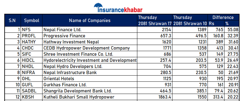 त्यस्तै दोश्रोमा प्रोग्रेशिभ फाइनान्स लिमिटेडको शेयर मूल्य ३२.३९ प्रतिशतले वृद्धि भएको छ । गत साता ४९६.५० रुपैयाँमा बन्द भएको कम्पनीको बजार मूल्य यो साता ६५७.३० रुपैयाँमा बजार मूल्य बन्द भएको छ । यो साता कम्पनीको बजार मूल्य प्रति कित्ता १६०.८० ले बढेको छ ।