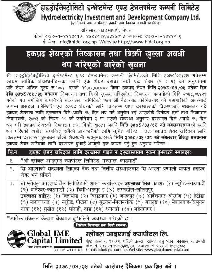 काठमाडौं । हाइड्रोइलेक्ट्रीसिटी इन्भेष्टमेण्ट एण्ड डेभलपमेण्ट कम्पनी (एचआईडिसीएल) को शतप्रतिशत हकप्रद शेयरमा आवेदन दिने समय थप गरिएको छ । कम्पनीले साउन ५ गतेदेखि आज २५ गतेसम्मका लागि निष्काशन गरेको एक बराबर एक अनुपातको हकप्रद शेयरमा आवेदन दिने समय लम्बिएको हो ।