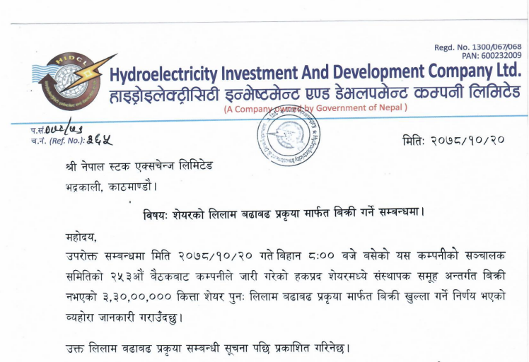 काठमाडौ. । हाइड्रोइलेक्ट्रोसिटि इन्भेष्टमेन्ट एण्ड डेभलपमेन्ट कम्पनी लिमिटेड (एचआईडिसीएल) ले लिलामीमा विक्री खुला गरेको हकप्रद शेयर पुनः लिलामीमा विक्री खुला गरेको छ । कम्पनीले ३ करोड ३० लाख कित्ता शेयर पुनः लिलाम गर्ने भएको हो । हकप्रद शेयरमध्ये विक्री नभएको संस्थापक समूहको ३ लाख ३ करोड ३० लाख कित्ता शेयर पुनः लिलामीद्वारा विक्री गर्ने  कम्पनीले जनाएको छ ।