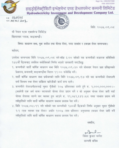 हाइड्रोइलेक्ट्रिसिटी एण्ड इन्भेष्टमेन्ट कम्पनी लिमिटेडले (एचआईडीसीएल) सेयरधनीलाई १० प्रतिशत बोनस सेयर दिने भएको छ ।