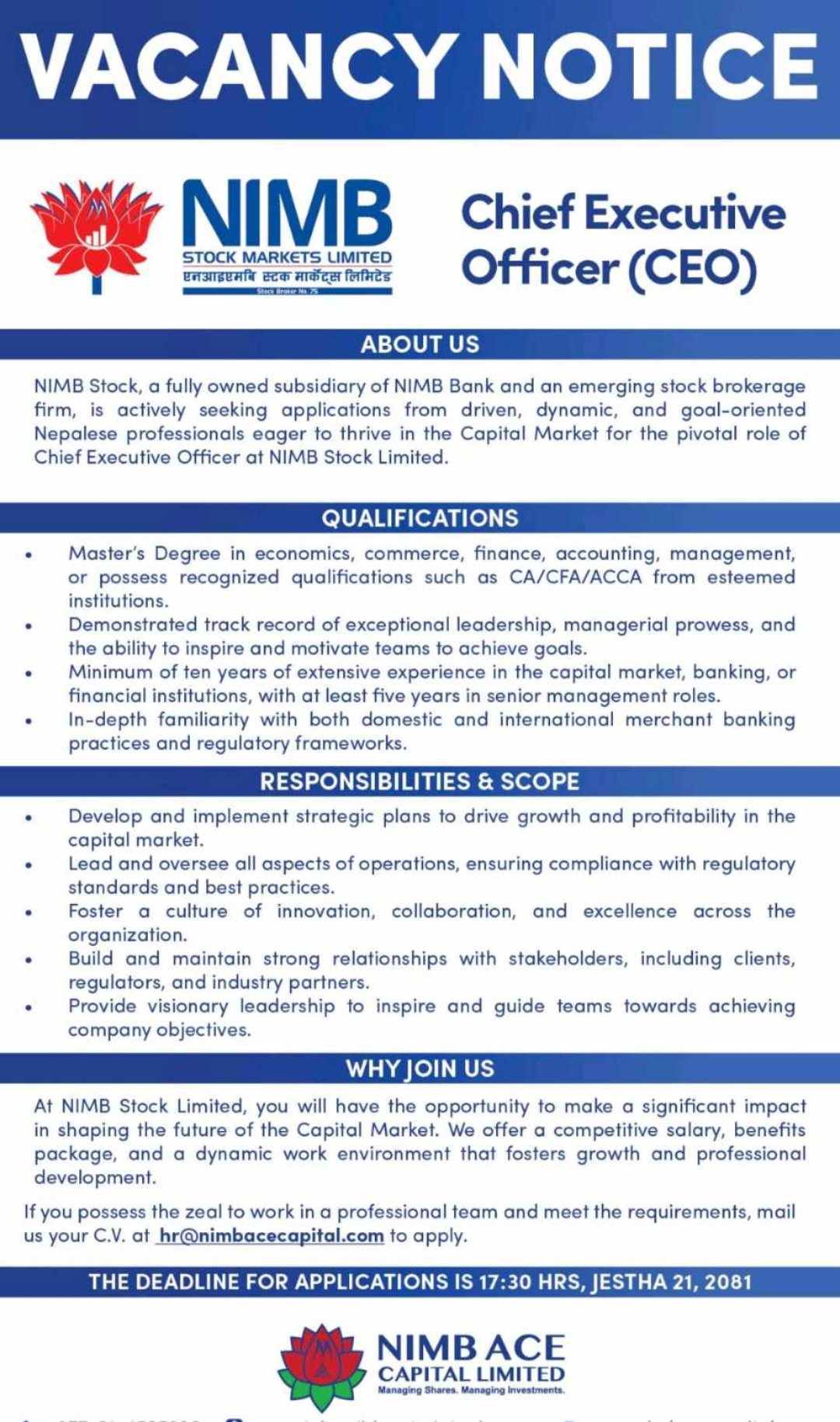 काठमाडौं । एनआइएमबी स्टक मार्केट लिमिटेडले चिफ एक्जुकेटिभ अफिसर (सिइओ) पदका लागि कर्मचारी माग गरेको छ । उक्त पदका लागि अर्थशास्त्र व्यवस्थापन, फाइनान्स, एकाउन्ट तथा कर्मसमा स्नाकोत्तर गरेको हुनुपर्नेछ । ईच्छुक तथा योग्यता पुगेकाले जेठ २१ गतेभित्र आवेदन दिनुपर्नेछ ।