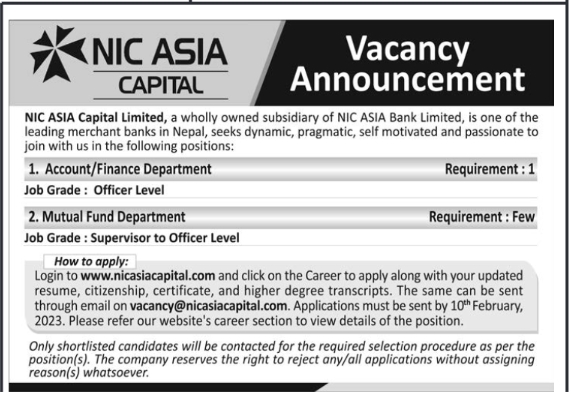 काठमाडौं । एनआइसी एशिया क्यापिटले कर्मचारी माग गरेको छ । कम्पनीले एक सूचना प्रकाशित गर्दै एकाउन्टेन्ट वा वित्तीय विभागका लागि १ जना र म्युचअल फण्ड डिपार्टमेन्टका लागि केहि संख्याका लागि कर्मचारीको माग गरेको हो । ईच्छुक तथा योग्यता पुगेकाले माघ २७ गतेसम्ममा कम्पनीको वेवसाइट मार्फत आवेदन दिन सकिने जनाएको छ ।