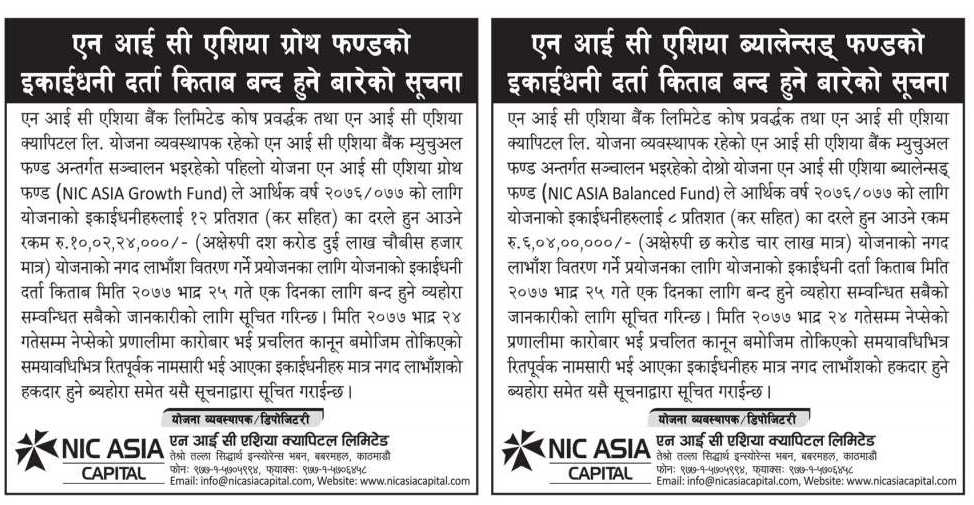 काठमाडौं । एनआइसी एशिया क्यापिटल लिमिटेड योजना व्यवस्थापक रहेको एनआइसी एशिया ग्रोथ फण्ड र एनआइसी एशिया ब्यालेन्स फण्डको नगद लाभांश सुरक्षित गर्ने आज अन्तिम दिन रहेको छ ।