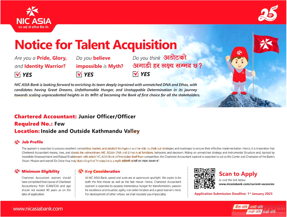 काठमाडौं । एनआइसी एशिया बैंक लिमिटेडले कर्मचारीको माग गरेको छ । बैंकले जुनियर अफिसर र अफिसर पदका लागि केहि संख्यामा कर्मचाको माग गरेको हो । उक्त पदहरुमा आवेदन दिनको लागि चार्टर्ड काउन्टेन्ट सम्बन्धि अध्ययन गरेको हुनुपर्ने बैंकले जनाएको हो ।