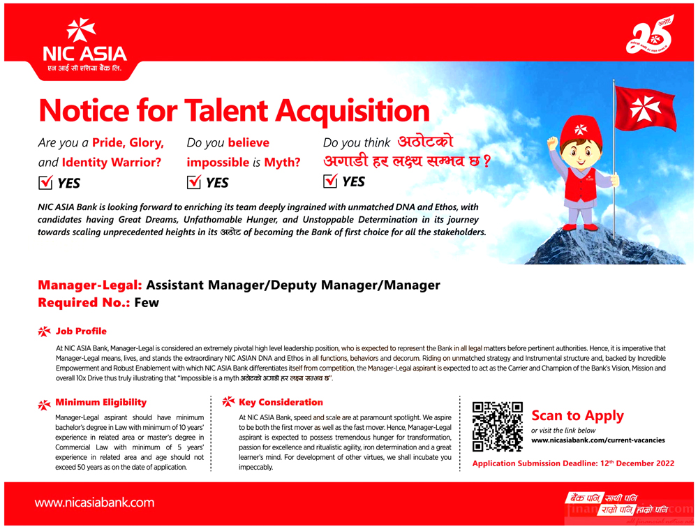 काठमाडौं । एनआइसी एशिया बैंक लिमिटेडले कर्मचारीको माग गरेको छ । कम्पनीले असिस्टेन्ट म्यानेजर र डेपुटी म्यानेजर, म्यानेजरका लागि केही संख्यामा कर्मचारीको माग गरेको हो ।