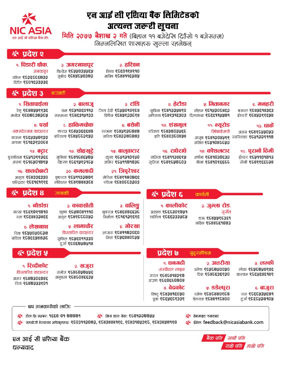 काठमाडौं । एनआइसी एशिया बैंकले विभिन्न शाखा कार्यालयबाट सेवा दिने भएको छ । बैंकले विहान ११ बजेदेखि दिउँसो १ बजेसम्मका लागि विभिन्न शाखा खुल्ला हुने जानकारी गराइएको छ