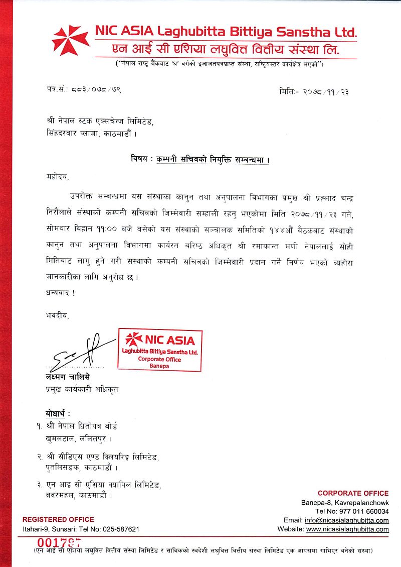 काठमाडौं । एनआइसी एशिया लघुवित्त वित्तीय संस्था लिमिटेडले कम्पनी सचिवमा कम्पनीका कानून तथा अनुपालना विभागमा कार्यरत वरिष्ठ अधिकृत रमाकान्त मणी नेपाल नियुक्ती भएका छन् । कम्पनीको फागुन २३ गते बसेको सञ्चालक समितिको बैठकले सोमवारदेखि लागू हुने गरी कम्पनी सचिवको जिम्मेवारी नेपाललाई दिएको जनाएको छ ।