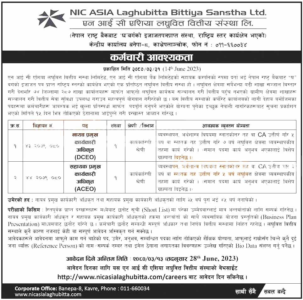 काठमाडौं । एनआइसी एशिया लघुवित्त वित्तीय संस्था लिमिटेडले २ पदहरुका लागि कर्मचारी माग गरेको छ । संस्थाले नायव कार्यकारी अधिकृत र सहायक प्रमुख कार्यकारी पदका लागि कर्मचारी माग गरेको हो । संस्थाले आफ्नो कर्पोरेट कार्यालयको लागि उक्त पदमा खुल्ला प्रतिस्प्रर्धा मार्फत कर्मचारी पदपूर्ति गर्ने भएको छ ।