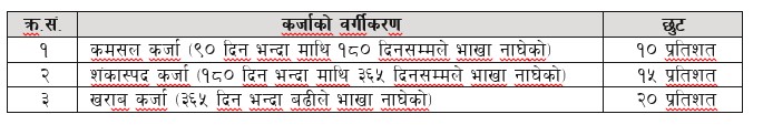 संस्थाले प्रचलित नियमनकारी व्यवस्था अनुसार २०८० फाल्गुन मसान्तमा निष्क्रिय कर्जाको रुपमा वर्गीकरण भएका कर्जाहरुको हकमा सम्बन्धित ऋणीले भुक्तान गर्ने मितिसम्मको पाकेको ब्याज तथा किस्ता रकम पूर्ण रुपमा चुक्ता भुक्तान गर्नुको साथै सम्पूर्ण कर्जा रकम नै २०८० चैत्र मसान्त भित्र पूर्ण रुपमा चुक्ता भुक्तान गरेमा भुक्तान गर्ने मितिसम्म लाग्ने जरिवाना तथा हर्जाना रकममा शत प्रतिशत छुट र ब्याज रकममा समेत संलग्न तालिकामा उल्लेख भएको योजना बमोजिम छुट प्रदान गर्ने “ब्याज छुट योजना” ल्याएको हो ।