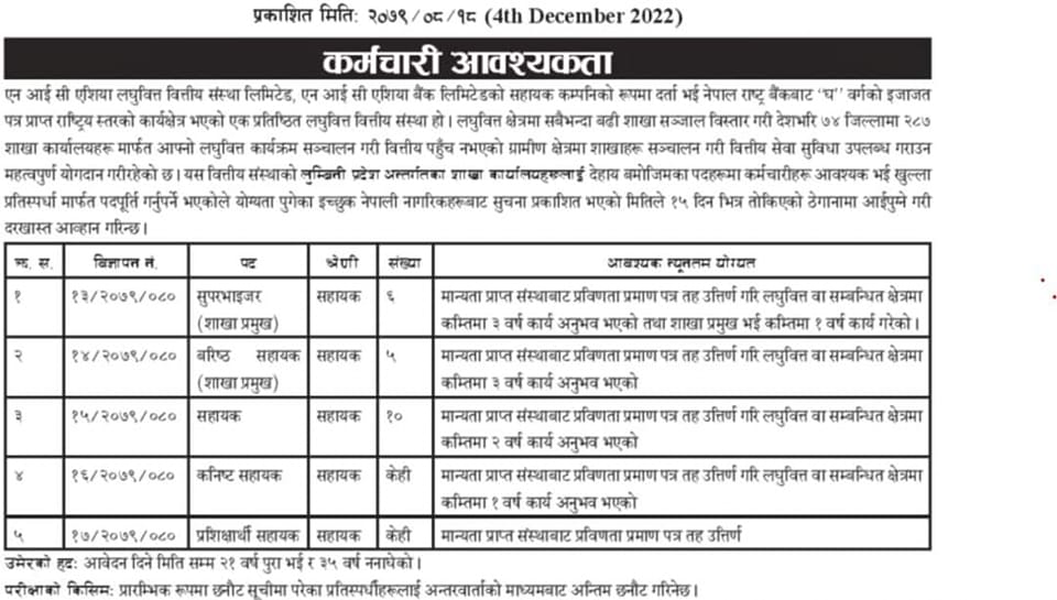 कम्पनीले शाखा प्रमुखका लागि कर्मचारीको माग गरेको हो । ईच्छुक तथा योग्यता पुगेकाले सुचना प्रकाशित भएको मितिले १५ दिनभित्र आवेदन दिनुपर्नेछ ।