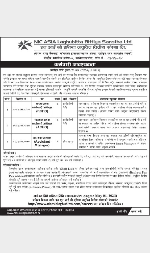 काठमाडौं । एनआइसी एशिया लघुवित्त वित्तीय संस्था लिमिटेडले विभिन्न पदका लागि कर्मचारीको माग गरेको छ । कम्पनीले नायब प्रमुख कार्यकारी अधिकृतमा १ जना, सहायक प्रमुख कार्यकारी अधिकृतमा १ जना र सहायक प्रबन्धकमा ४ जना कर्मचारी माग गरेको हो ।