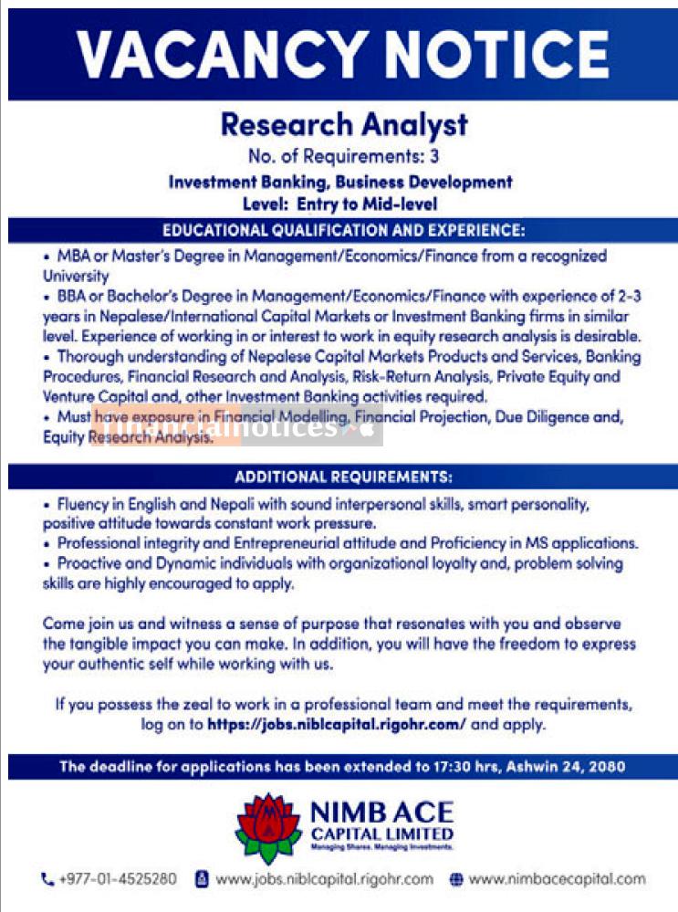 काठमाडौं । एनआईएमबि एस क्यापिटलले रिसर्च एनालिष्टका लागि ३ जना कर्मचारी माग गरेको छ । कम्पनीले मान्यताप्राप्त शैक्षिक संस्थाबाट व्यवस्थापन, अर्थशास्त्र तथा फाइनान्सबाट एमबिए, बीबीए, मास्टर तथा ब्याचलर डिग्री गरेको हुनुपर्ने जनाएको छ । ईच्छुक तथा योग्यता पुगेकाले असोज २४ गतेसम्म आवेदन दिन सक्नेछन् ।