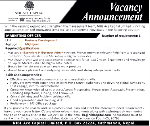 काठमाडौं । एनआईबिएल एस क्यापिटल लिमिटेडले कर्मचारी माग गरेको छ । क्यापिटलले मार्केटिङ अफिसर पदमा १ जना कर्मचारी माग गरेको हो । सो पदमा आवेदन दिनको लागि मान्यता प्राप्त शैक्षिक संस्थाबाट स्नाकोत्तर तह उत्तिर्ण गरेको हुनुपर्ने जनाएको हो ।