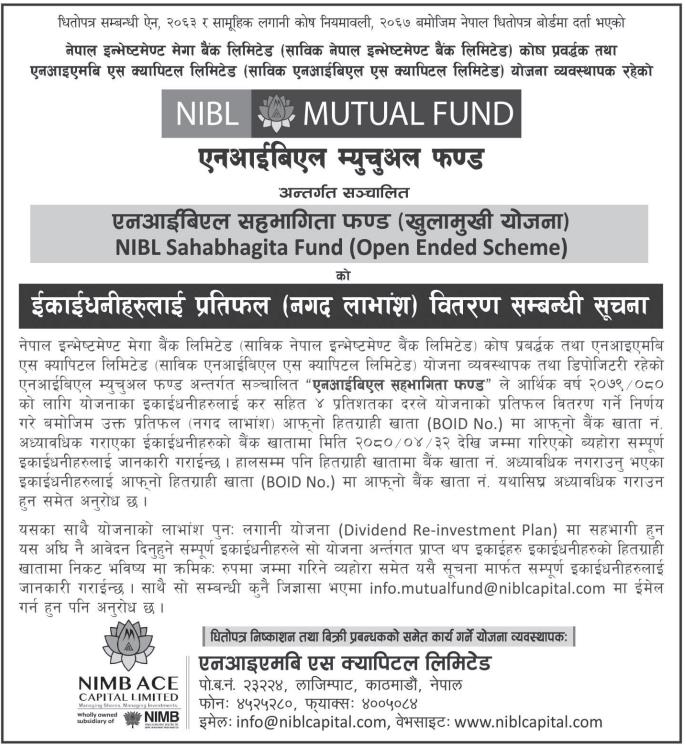 यस वर्षको लाभांश प्रयोजनका लागि साउन ११ गते बुक क्लोज गरिएको हुँदा साउन १० गतेसम्म कायम इकाईधनीहरूले मात्र लाभांश प्राप्त गर्न योग्य भएका छन् ।
