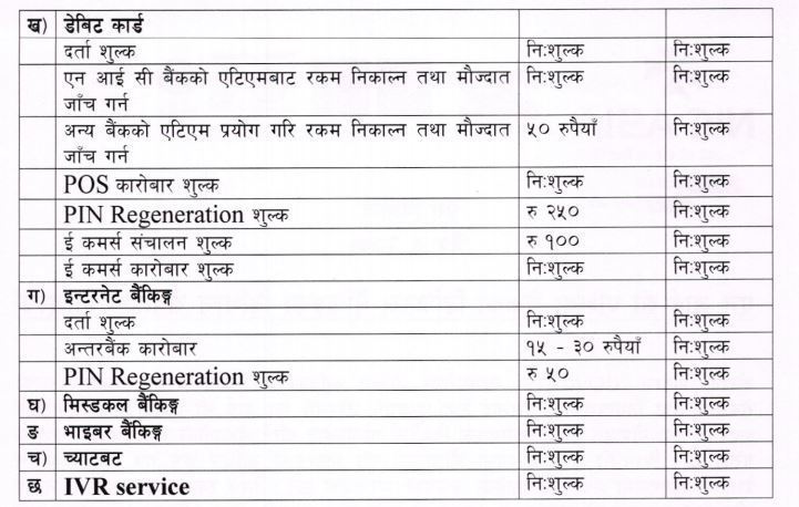 बैंकले ग्राहकको स्वास्थ्य तथा सुविधालाई मध्यनजर गर्दै ग्राहकलाई घरमै बसेर अनलाईन खाता खोल्न मिल्ने सुविधा प्रदान गर्नुको साथै, इन्टरनेट तथा मोबाइल बैंकिङ्ग लगायका विद्युतीय माध्यमबाट गरिने निम्नलिखित भुक्तानीका सेवाहरू अर्काे सूचना जारी नगरेसम्मको लागि निःशुल्क गरेको जनाइएको छ ।