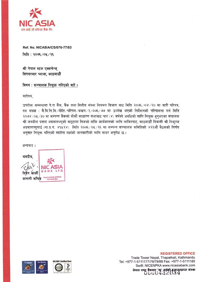 बैंकको २०७४ साल भदौ ३० गते सम्पन्न साधारण सभाले ४ वर्षको लागि सो पदमा जगदीश प्रसाद अग्रवाललाई नियुक्त गरेको भएपनि बैंकको बिहीबार बसेको सञ्चालक समितिको बैठकले निजको सट्टामा निकुञ्ज अग्रवाललाई बाँकी कार्यकालको लागि नियुक्त गरेको जानकारी दिएको छ ।