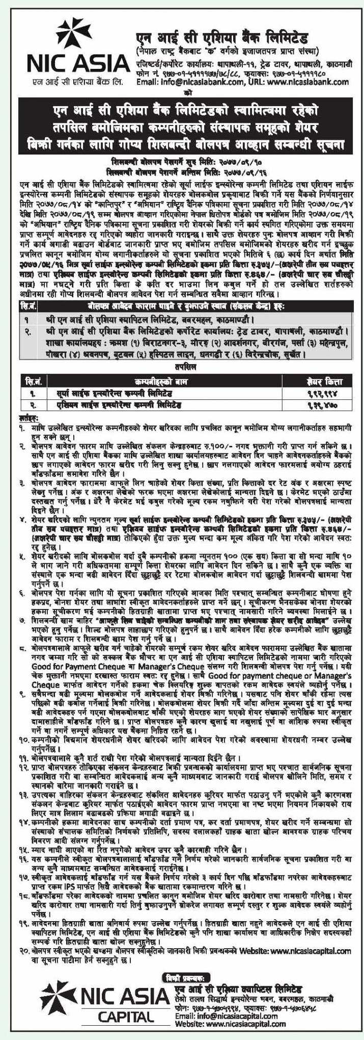 बोलपत्र आवेदन एनआइसी एशिया क्यापिटल लिमिटेड र एनआईसी एशिया बैंक लिमिटेडका विराटनगर, बीरगंज, महेन्द्रपुल, श्रवनपथ बुटवल, हस्पिटल लाइन धरान र विरेन्द्रचोक सुर्खेत शाखा कार्यालयहरुबाट दिन सकिनेछ ।