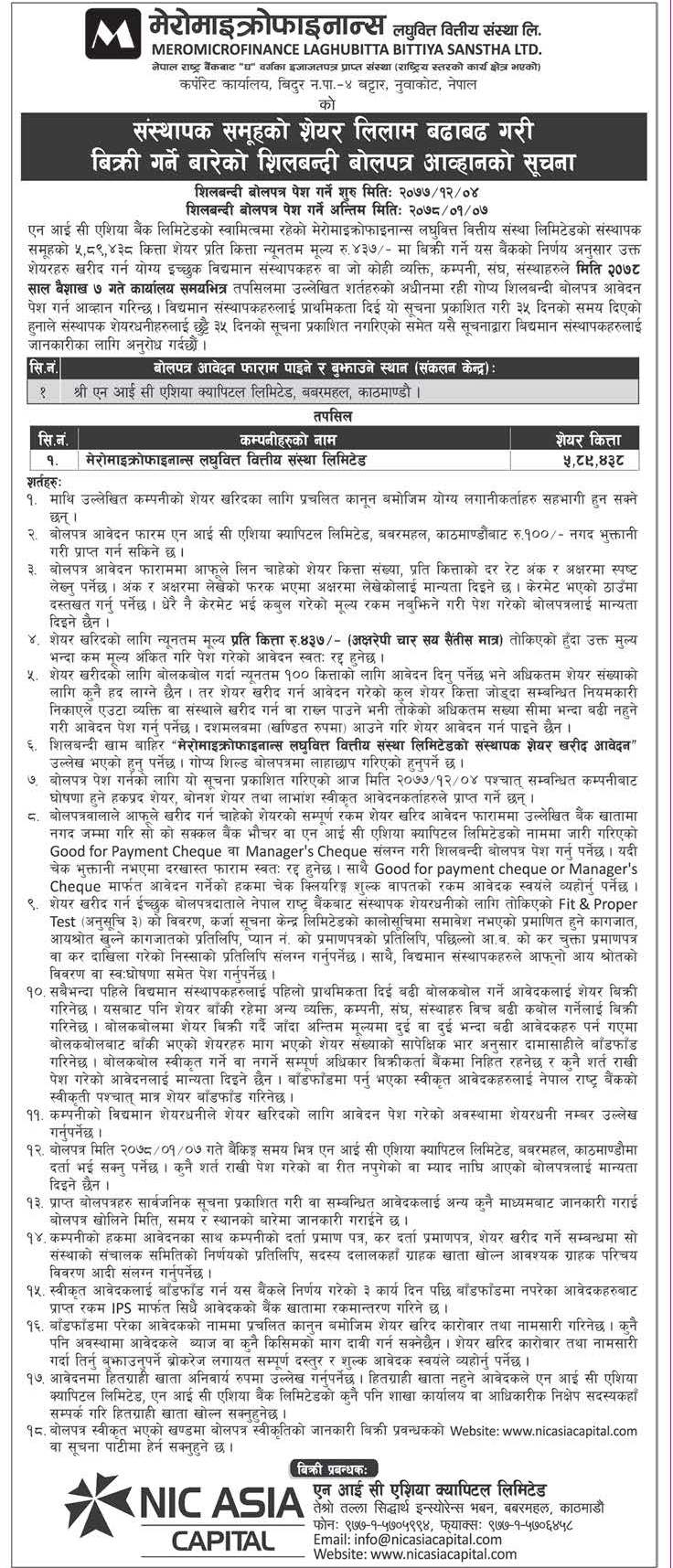 काठमाडौँ । एनआईसी एशिया बैंक लिमिटेडको आफ्नो स्वामित्वमा रहेको मेरो माइक्रोफाइनान्सको संस्थापक समूहको शेयर लिलाम बढाबढ गरी आजदेखि बिक्री खुल्ला गर्दैछ । संस्थाले ५ लाख ८९ हजार ४ सय ३८ कित्ता संस्थपक शेयर प्रति कित्ता न्यूनतम मूल्य ४ सय ३७ रूपैयाँमा बिक्री गर्न लागेको जनाएको छ ।