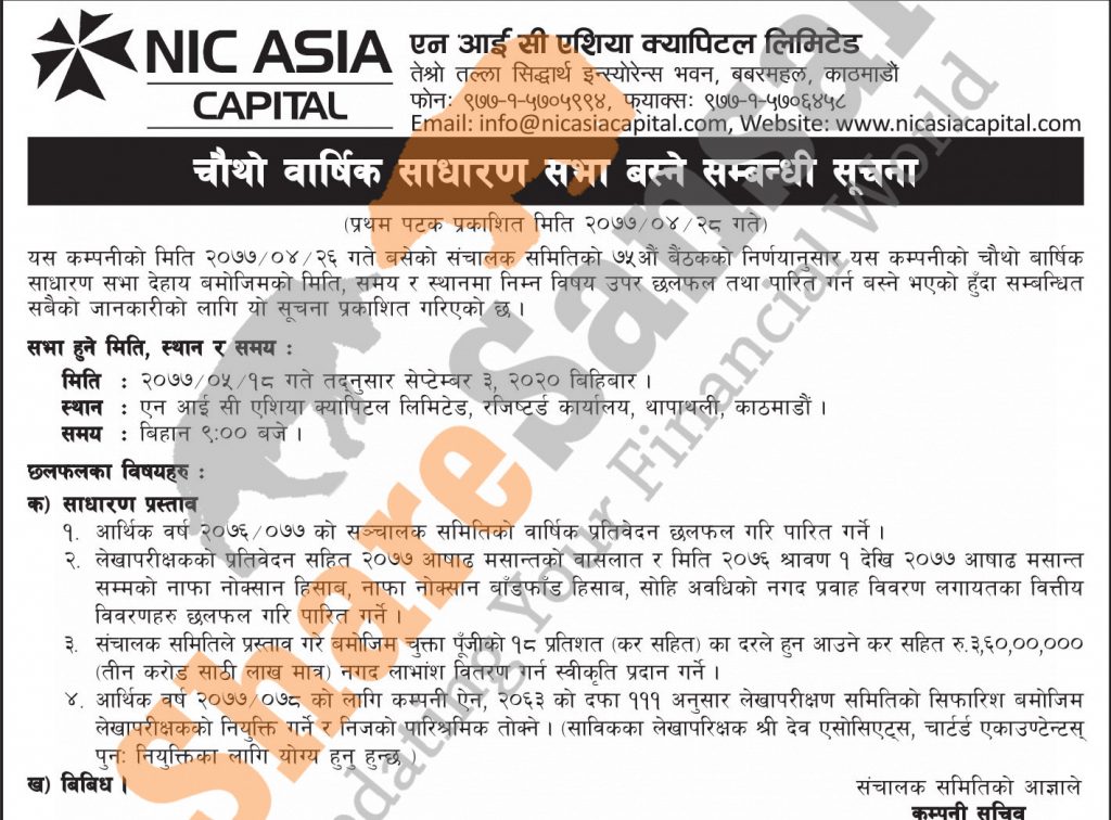 काठमाडौं । एनआईसी एशिया क्यापिटलको चौथो वार्षिक साधारण सभा भदौ १८ गते (बिहिबार) हुने भएको छ । उक्त सभा क्यापिटलको रजिष्टर्ड कार्यालय थापाथली, काठमाडौंमा बिहान ९ बजे हुने भएको हो ।