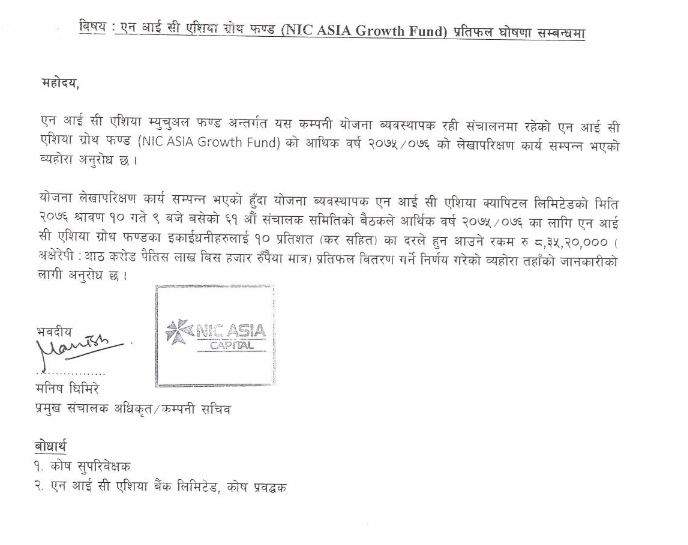 एनआईसी एशिया म्युचल फण्ड अन्तर्गत संचालित यस फण्डले कर सहित १० प्रतिशतले हुन आउने ८ करोड ३५ लाख २० हजार रुपैयाँ वितरण गर्ने जानकारी दिइएको छ ।