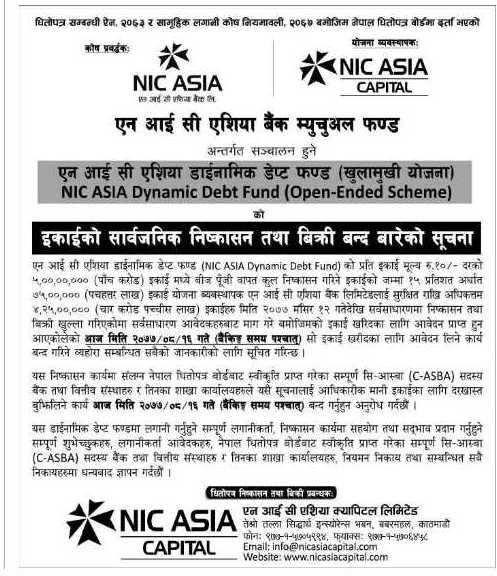काठमाडौँ । एनआईसी एशिया म्युचुअल फण्ड अन्तर्गत सञ्चालन हुने एनआईसी एशिया डाइनामिक डेब्ट फण्डको इकाईमा आवेदन दिने आज अन्तिम दिन रहेको छ ।