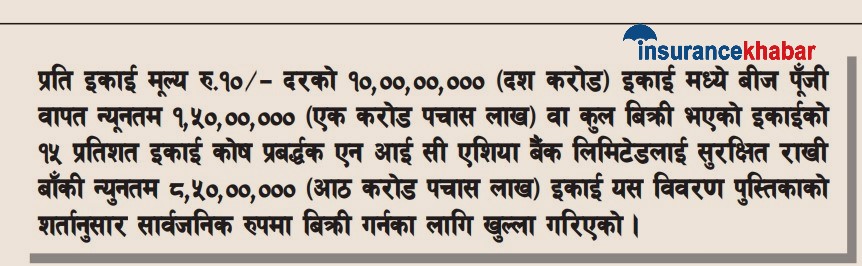 काठमाडौं । एन आई सी एशिया बैंक म्युचुअल फण्ड अन्तर्गत सञ्चालन हुने एन आई सी एशिया फ्लेक्सी क्याप फण्डले आजबाट (जेष्ठ १९) आईपीओ निस्काशन गर्दै छ। प्रति इकाई मूल्य रु. १० दरको १० करोड इकाई मध्ये बीज पुँजी वापत न्यूनतम १ करोड ५० लाख वा कुल बिक्री भएको इकाईको १५ प्रतिशत इकाई कोष प्रवर्द्धक एन आई सी एशिया बैंक लिमिटेडलाई सुरक्षित राखी बाँकी न्युनतम ८ करोड ५० लाख इकाई सार्वजनिक रुपमा बिक्री गर्नका लागि खुल्ला गरिएको छ ।