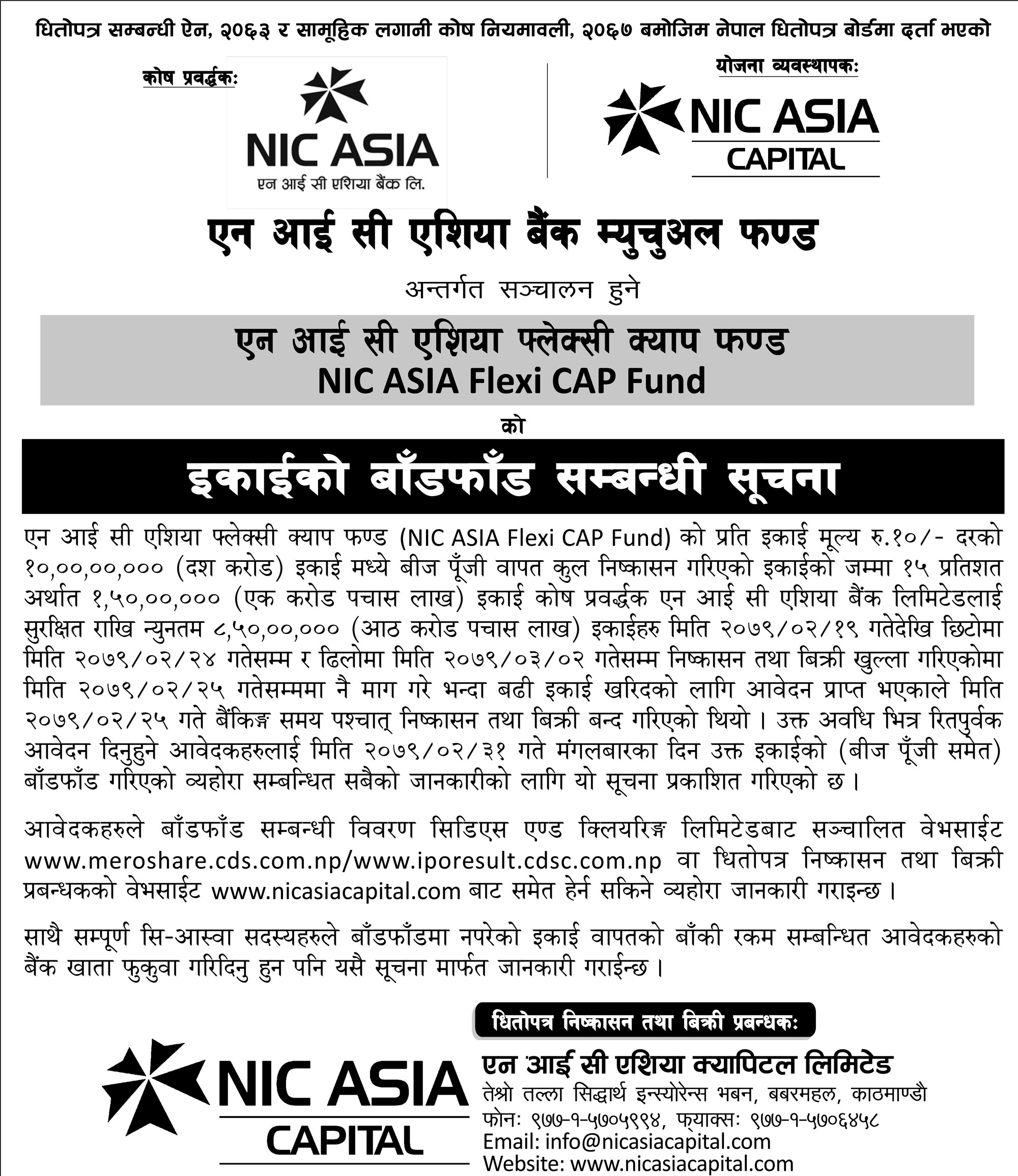 काठमाडौं । एनआईसी एशिया क्यापिटल लिमिटेडले निष्काशन गरेको एनआईसी एशिया फ्लेक्सी क्याप फण्डको इकाई बाँडफाँड भएको छ । एनआइसी एशिया क्यापिटलको व्यवस्थापनमा सञ्चालन हुन लागेको यस फण्डको १० रुपैयाँ अंकित दरमा एक अर्ब रुपैयाँ बराबरको १० करोड इकाई जेठ १९ गतेदेखि जेठ २५ गतेसम्म विक्री खुला गरिएको थियो ।