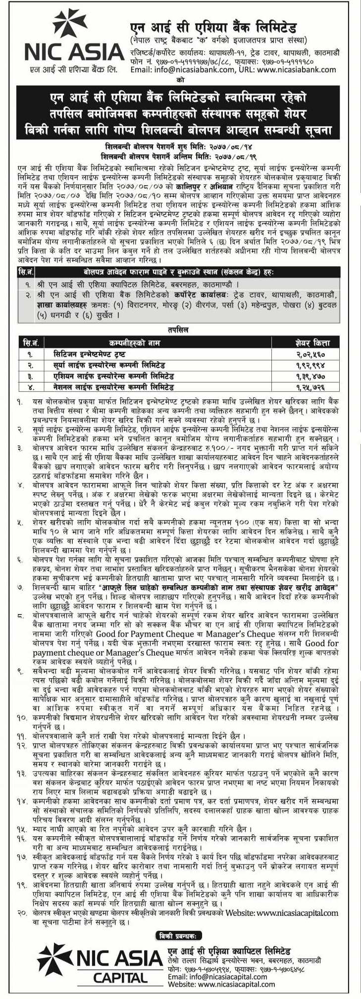 बैंकले नागरिक लगानी कोषको २ लाख २ हजार ५ सय ६० कित्ता, सूर्या लाइफ इन्स्योरेन्स कम्पनी लिमिटेडको एक लाख ९२ हजार ९ सय ९४ कित्ता, एशियन लाइफ इन्स्योरेन्स कम्पनी लिमिटेडको एक लाख ३९ हजार ४ सय ७० कित्ता र नेशनल लाइफ इन्स्योरेन्स कम्पनी लिमिटेडको एक लाख २५ हजार ७ सय २६ कित्ता संस्थापक समूहको शेयरहरू लिलाम बढाबढ गरी बिक्री गर्न लागेको हो ।