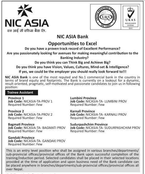 काठमाडौं । एनआईसी एशिया बैंकले ७ वटै प्रदेशका लागि कर्मचारीको माग गरेको छ । बैंकले ट्रेनी असिस्टेन्ट पदका लागि सातै प्रदेशमा कर्मचारीको माग गरेको हो ।