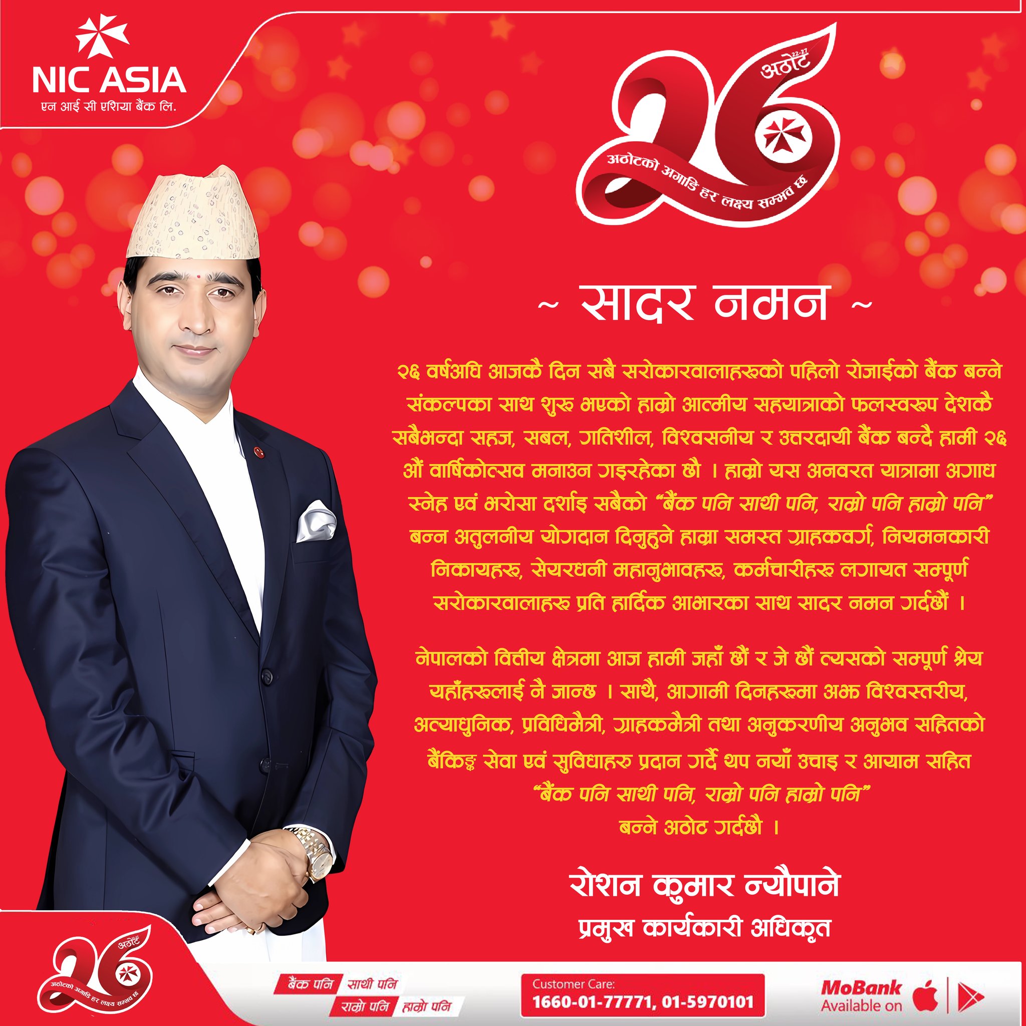 काठमाडौं । एनआईसी एशिया बैंकले आफ्नो २६औं वार्षिकोत्सव मनाउँदैछ । २६ वर्षअघि आजकै दिन सबै सरोकारवालाको पहिलो रोजाइको बैंक बन्ने संकल्पका साथ एनआईसी एशियाको सुरुआत भएको हो। आत्मीय सहयात्राको फलस्वरुप देशकै सबैभन्दा सहज, सबल, गतिशील, विश्वसनीय र उत्तरदायी बैंक बन्दै २६ औं वार्षिकोत्सव मनाउन गइरहेको बैंकले जनाएको हो ।