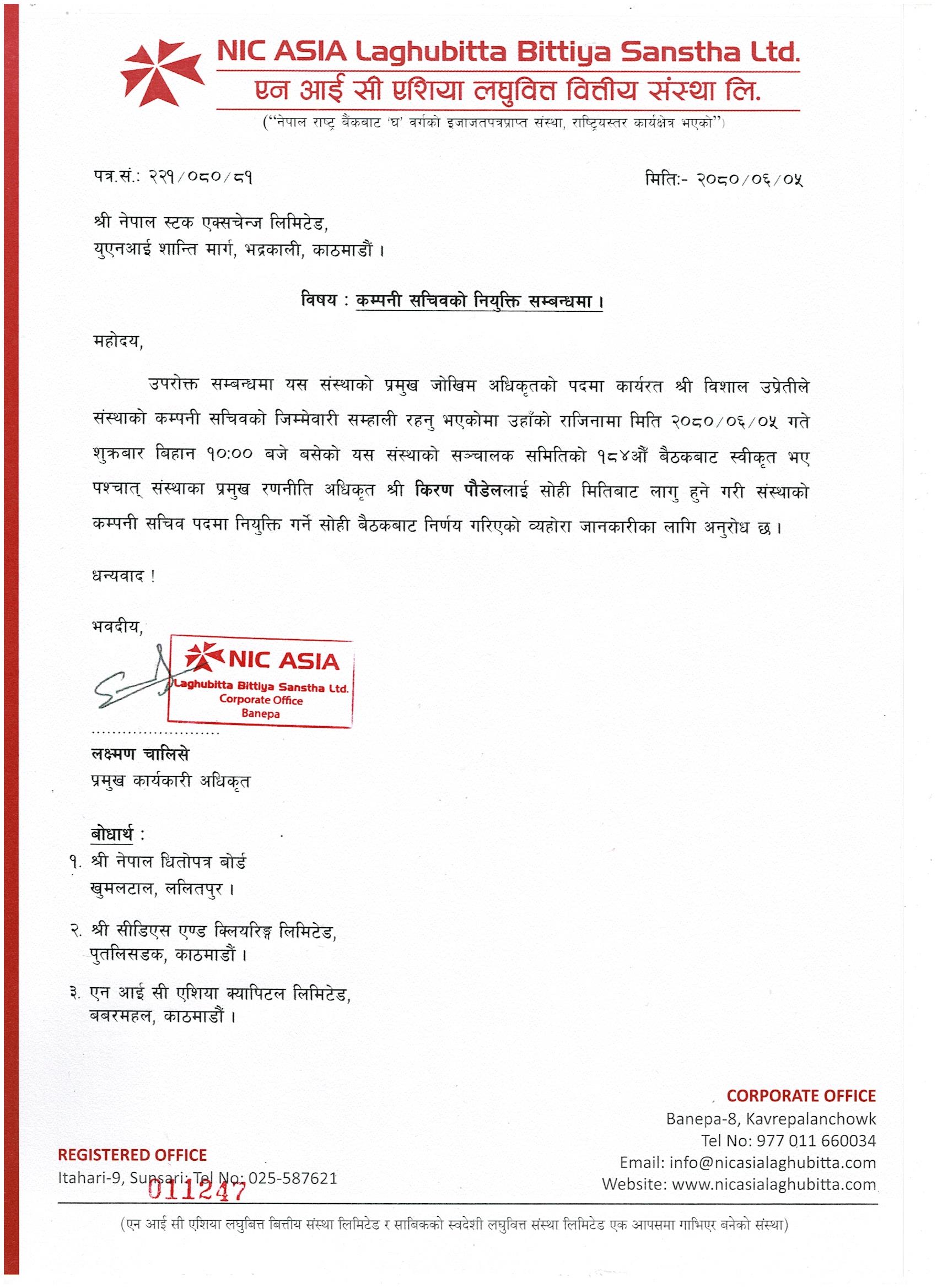एनआईसी एशिया लघुवित्तको कम्पनी सचिवमा पौडेल नियुक्त