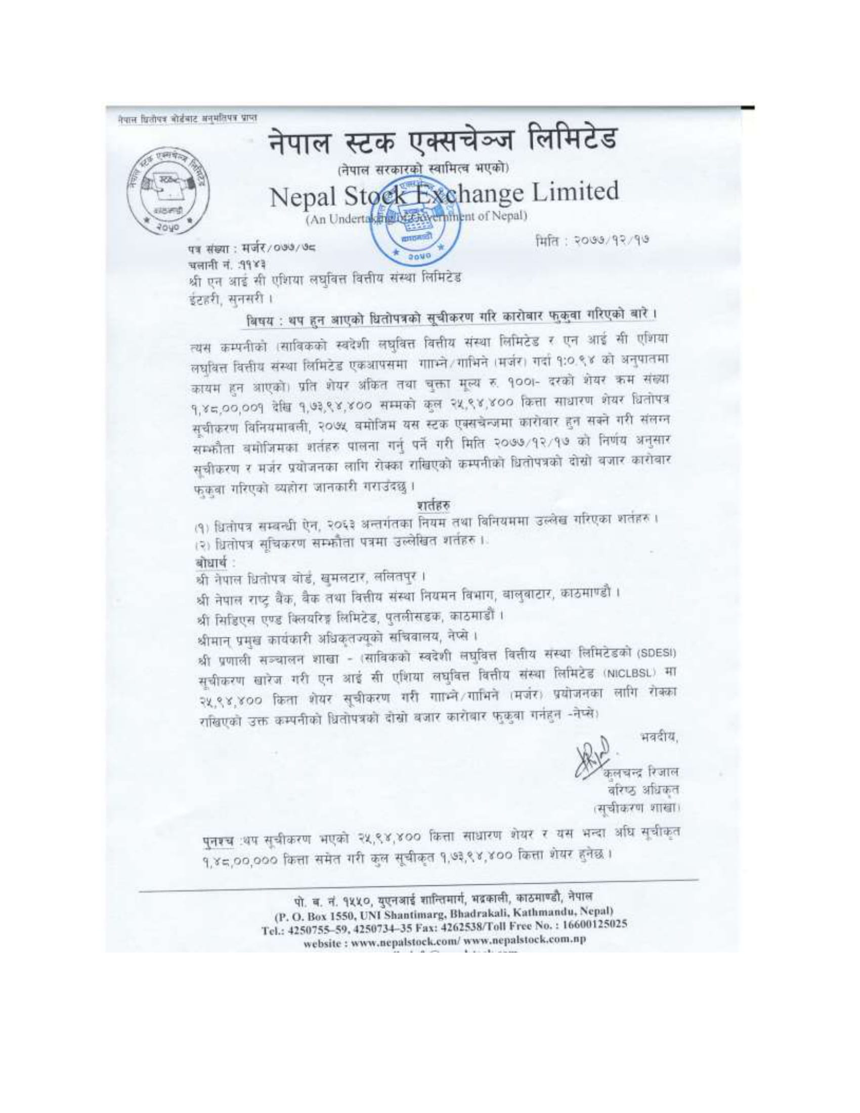 एनआईसी एशिया लघुवित्त वित्तीय संस्था लिमिटेड र स्वदेशी लघुवित्त वित्तीय संस्था लिमिटेड एक आपसमा १ः०.९४ को अनुपातमा गाभिँदा कायम हुन आएको प्रति शेयर अंकित तथा चुक्ता मूल्य १ सय रूपैयाँ दरको २५ लाख ९४ हजार ४ सय कित्ता शेयर धितोपत्र सूचिकरण विनियमावली, २०७५ बमोजिम नेप्सेमा कारोबार हुन सक्ने गरी सूचिकृत भएको छ ।