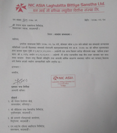 कम्पनीको उक्त प्रस्ताव नेपाल राष्ट्र बैंकले स्वीकृति दिएपछि कम्पनीको आगामी साधारणसभाले पारित गरेपछि मात्र लगानीकर्ताले पाउनेछन् ।
