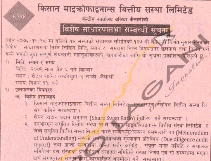 काठमाडौं । किसान माइक्रोफाइनान्स वित्तीय संस्था लिमिटेडले चैत ६ गते विशेष साधारण सभा आह्वान गरेको छ । माइक्रोफाइनान्सले बिहान ११ बजे होटल शान्ति लम्की चुहा, कैलालीमा सभा आब्हान गरेको हो ।