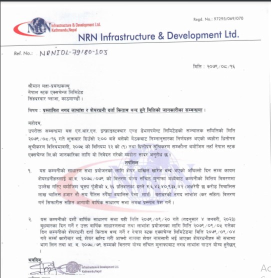 कम्पनीले साधारणसभा प्रयोजनको लागि पुस ५ गते बुक क्लोज गर्न निर्णय गरेको छ । पुस ४ गतेसम्म कायम शेयरधनीले मात्र सभामा भाग लिन र प्रस्तावित लाभांश पाउन सक्नेछन् ।