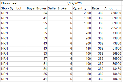 भाद्र ९ गते बाट एनआरएन इन्फ्रास्टक्चर एण्ड डेभलपमेण्टको शेयर कारोवार सुरु भएको थियो। भाद्र १० गते अर्थात बिहीबार कम्पनीको २,२७० वटा शेयर कारोवार भए पनि १४ वटा कारोवार १० कित्ता भन्दा माथि भएको थियो।