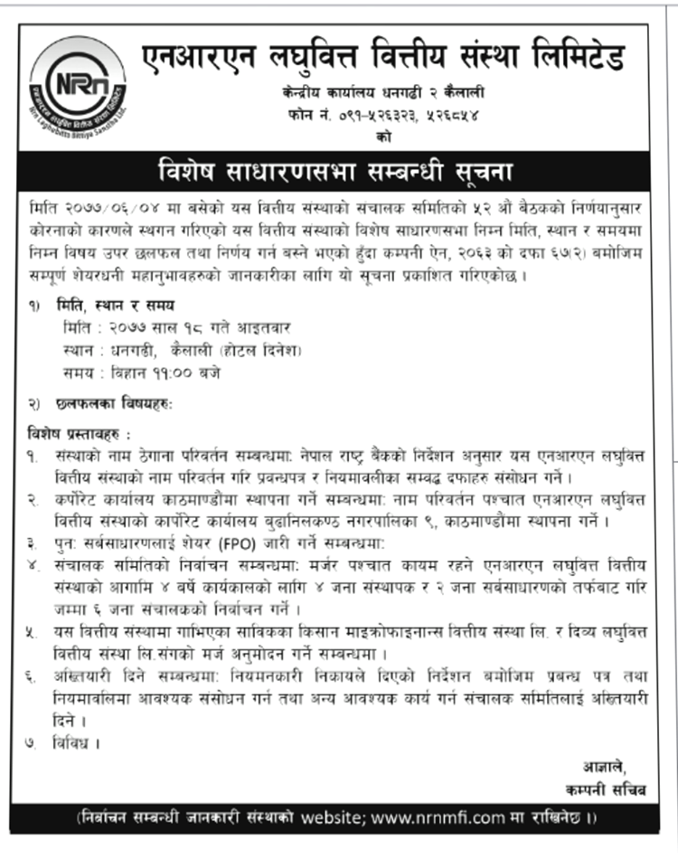 काठमाडौं । एनआरएन लघुवित्त वित्तीय संस्था लिमिटेडको विशेष साधारण सभा आज हुँदैछ । संस्थाको असोज ४ गते आइतबार बसेको सञ्चालक समितिको बैठकले गरेको निर्णय अनुसार उक्त सभाको मिति तय भएको हो । उक्त सभा होटल दिनेश, धनगढी, कैलालीमा बिहान ११ बजेबाट सुरू हुने संस्थाले जनाएको छ ।